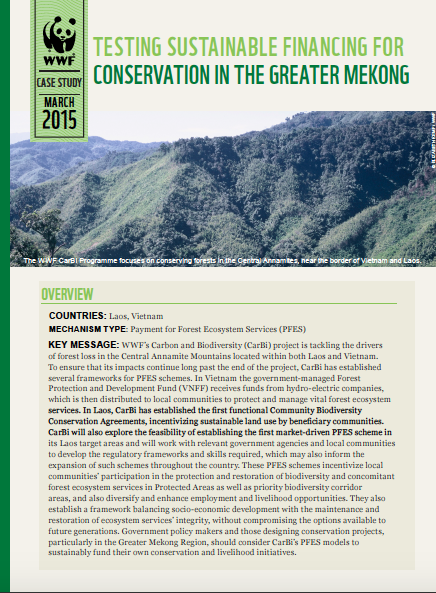WWF’s Carbon and Biodiversity (CarBi) project is tackling the drivers of forest loss in the Central Annamite Mountains located within both Laos and Vietnam. To ensure that its impacts continue long past the end of the project, CarBi has established several frameworks for PFES schemes. In Vietnam the government-managed Forest Protection and Development Fund (VNFF) receives funds from hydro-electric companies, which is then distributed to local communities to protect and manage vital forest ecosystem services. In Laos, CarBi has developed the first functional Community Biodiversity Conservation Agreements, incentivising sustainable land use by beneficiary communities.